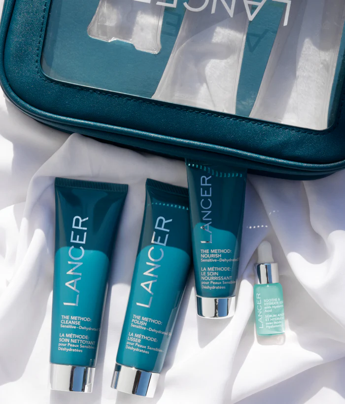 Our best-selling 3-Step Lancer Method® for Sensitive-Dehydrated Skin is now available in a chic TSA-approved travel bag with a 30+ day supply of Polish, Cleanse, Nourish and an introductory size of Soothe & Hydrate Serum.